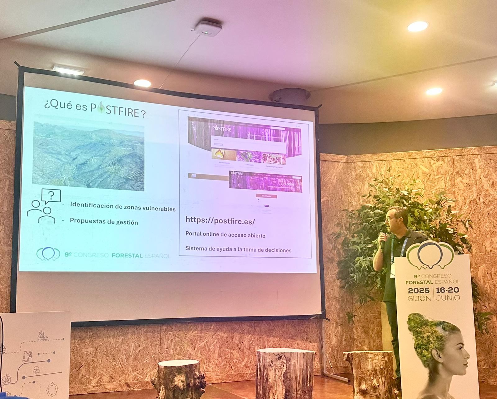 El pasado lunes 16 de junio de 2025 se presentó el portal POSTFIRE en el 9º Congreso Forestal Español. que tuvo lugar en Gijón entre los días 16 y 29 de Junio. Esta presentación tuvo lugar mediante la ponencia oral titulada “POSTFIRE, un portal abierto de ayuda a la gestión de zonas forestales quemadas” en la mesa temática de “Fuegos y otros riesgos abióticos”.
